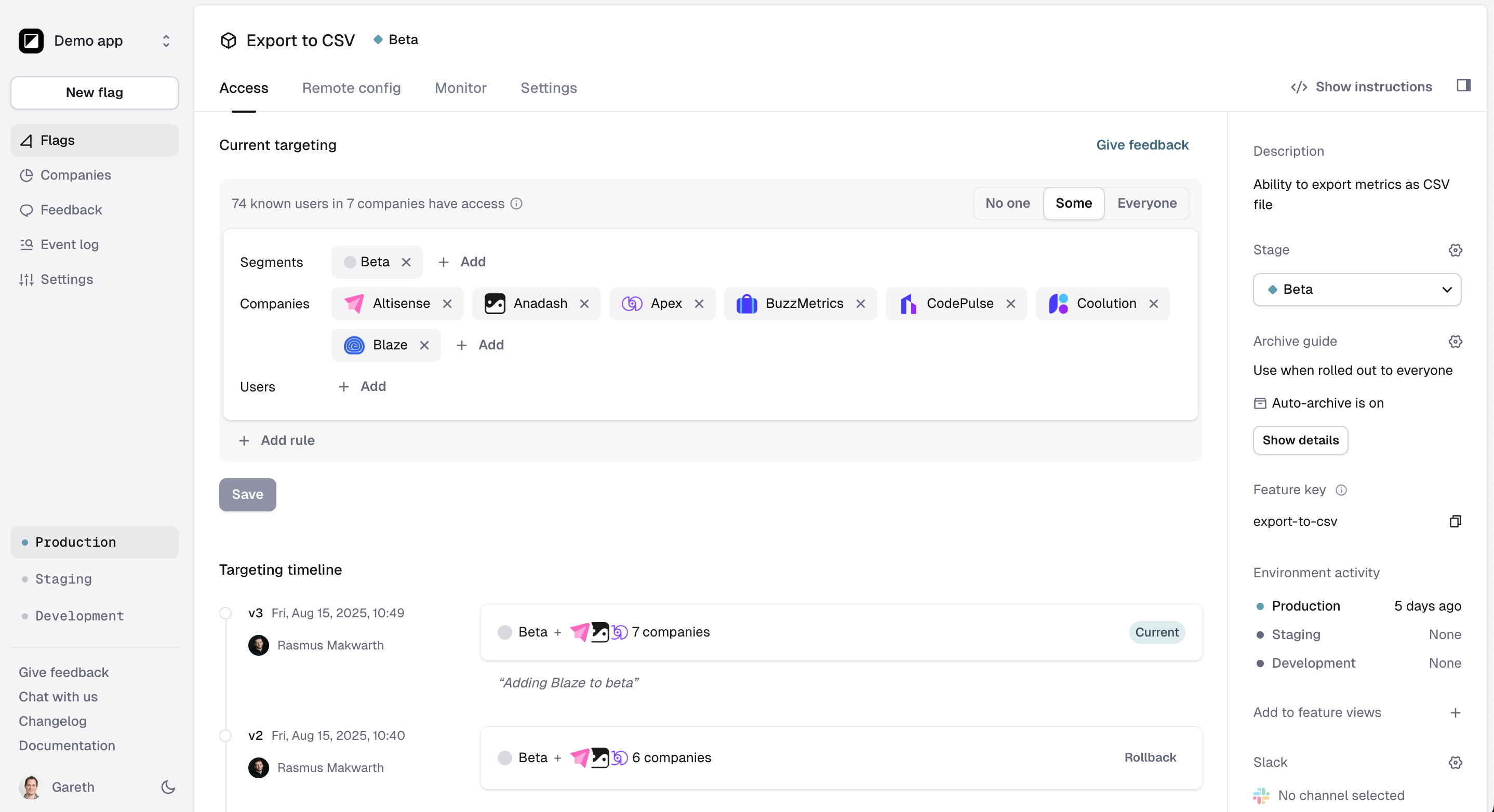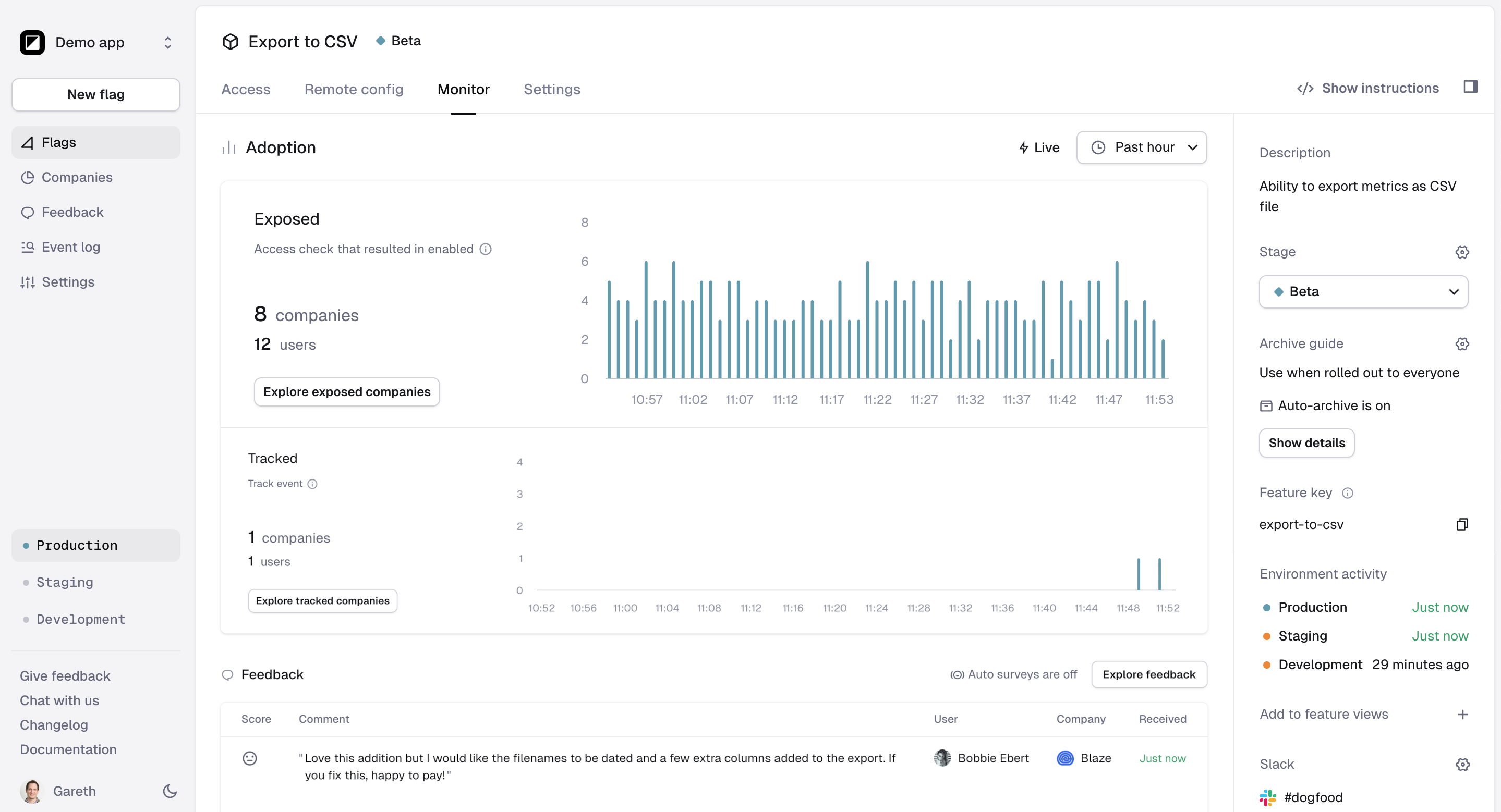 On the Monitor tab you can track real-time feature exposure, adoption and user feedback.