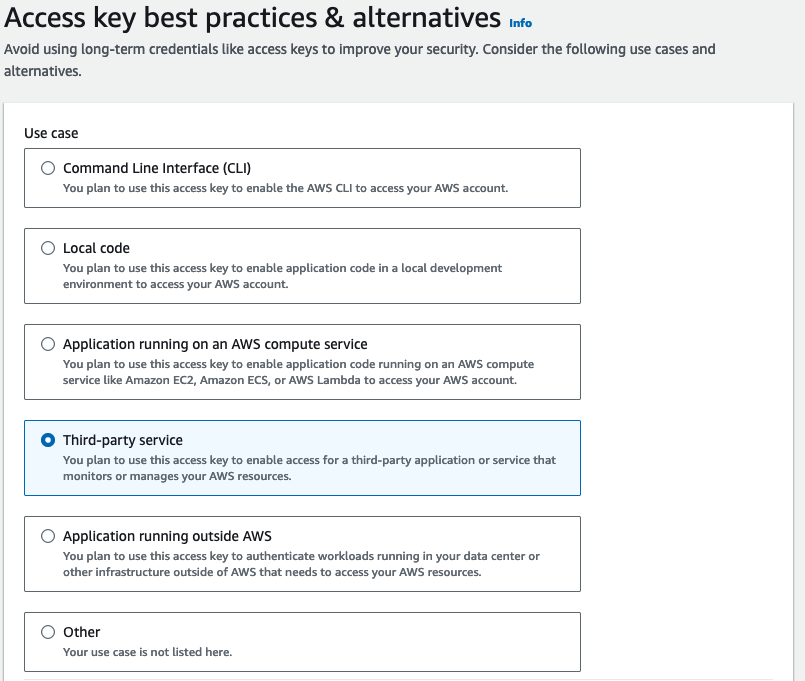 There, click `Create Access Key` to obtain a new **Access Key** and **Secret Access Key.**<br>