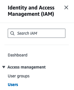 1. Log into the AWS Console. Navigate to `Identity and Access Management (IAM)` and select the `Users` option.<br>