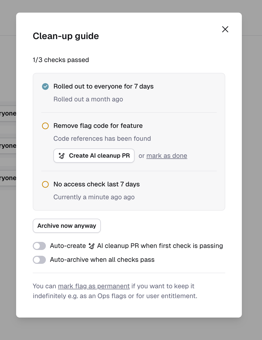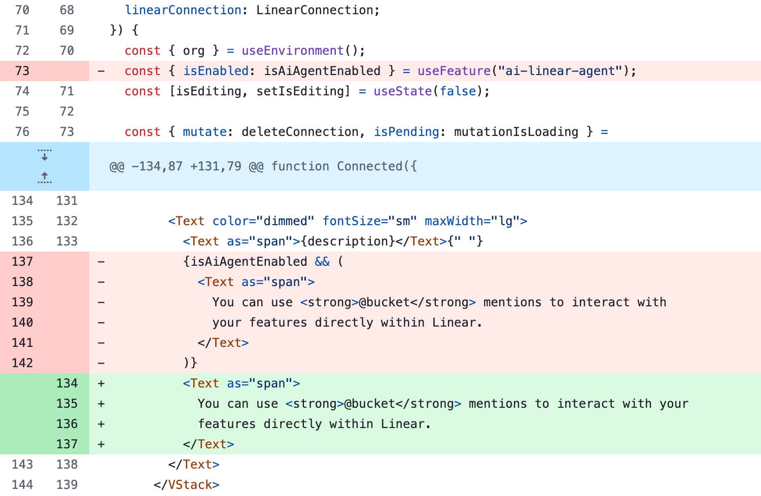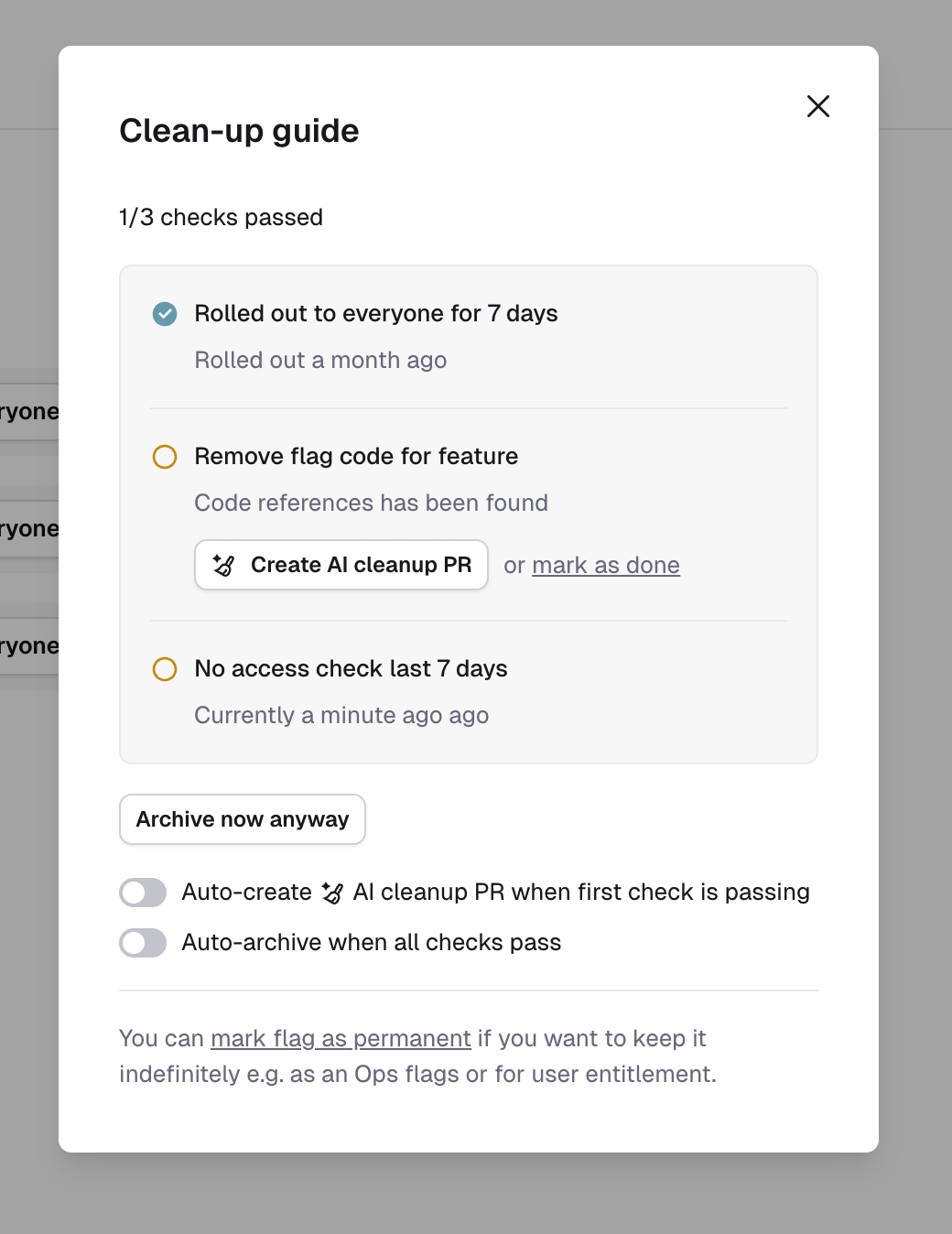 When the AI clean-up bot operates, it searches for usage of the Reflag SDK in your codebase and identifies where specific feature keys are used. LLMs are employed to intelligently refactor the code to remove the flag and eliminate codepaths that become unreachable.