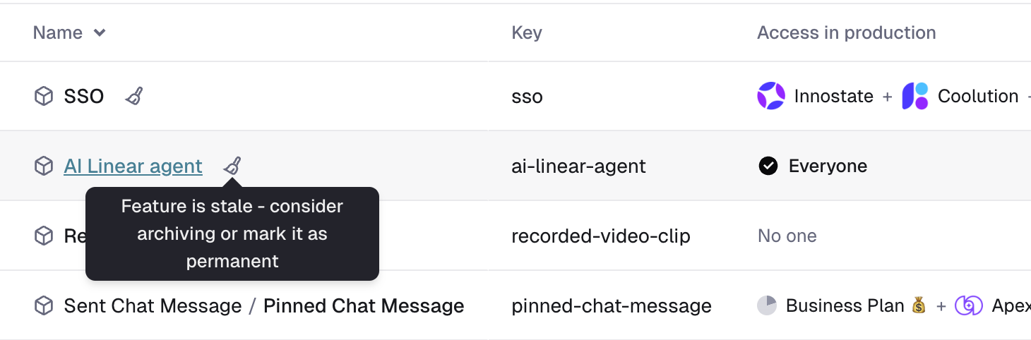 Find a stale feature that is ready for clean-up by looking for the broom icon in the features table.