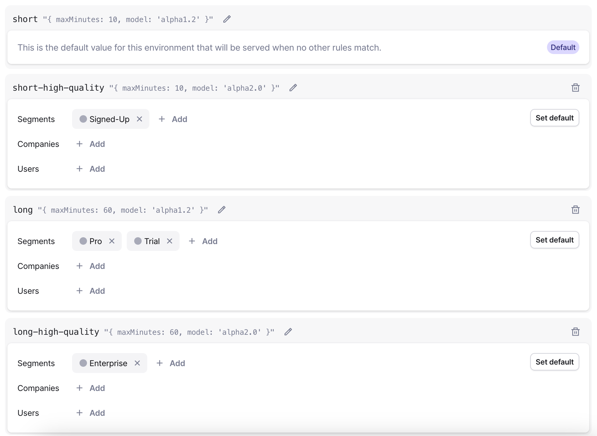 Users, companies and segments can appear only once in the targeting rules for each environment. This means that you cannot configure two distinct config values in the same environment to target the same entity explicitly