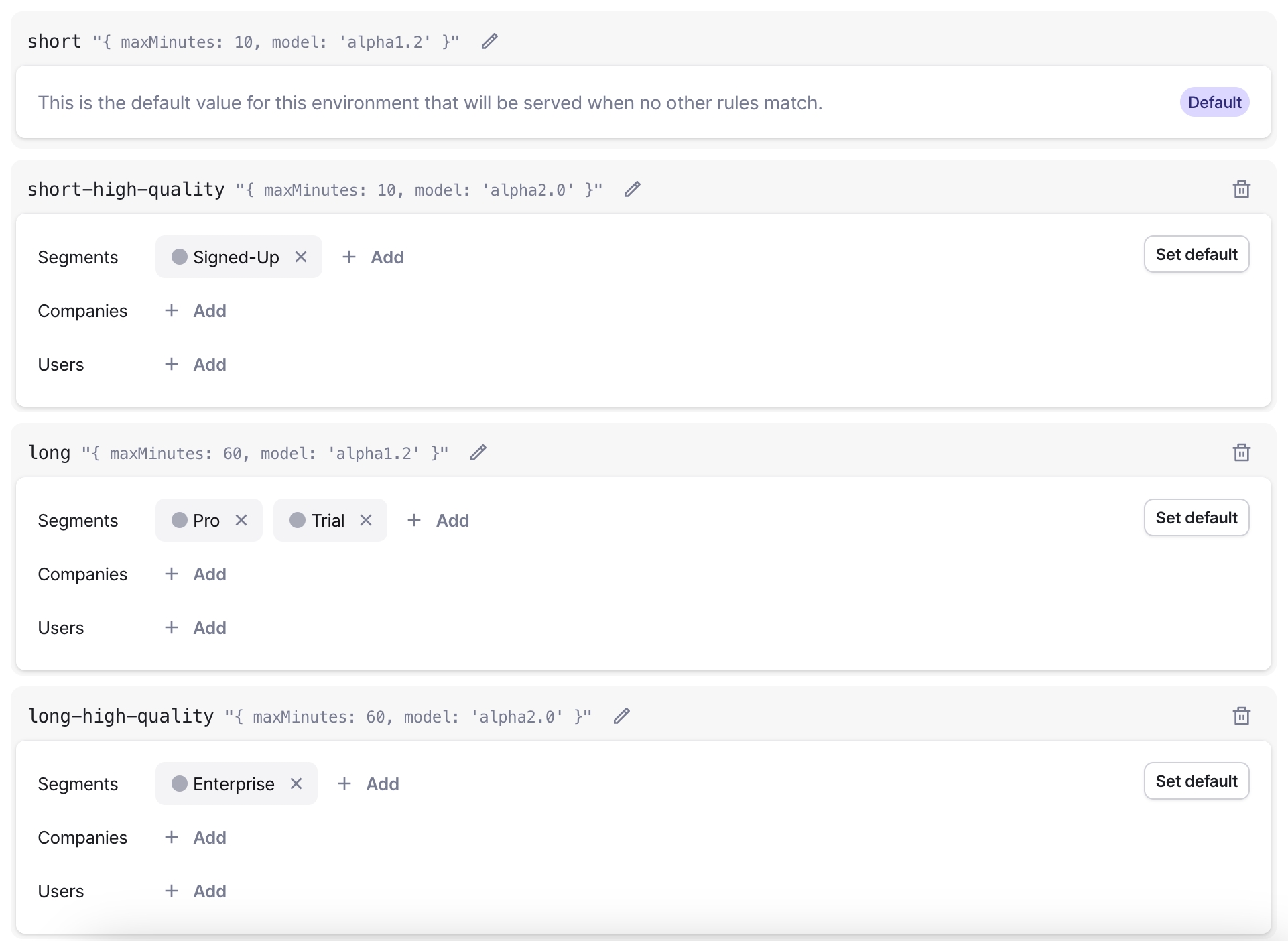 In the image above, a feature is set up to have three config values. This is an example of configuring LLM settings for an AI feature. The "gpt-4o" value is the default and served with all requests that do not match any other, more specific values. The "claude-3-7-sonnet" value will be served to users in "Apex" and "Blaze" companies while the "gpt-5" value will be served to the "Adrian Borer" user as well as the "Logix" and "Hightrix" companies.